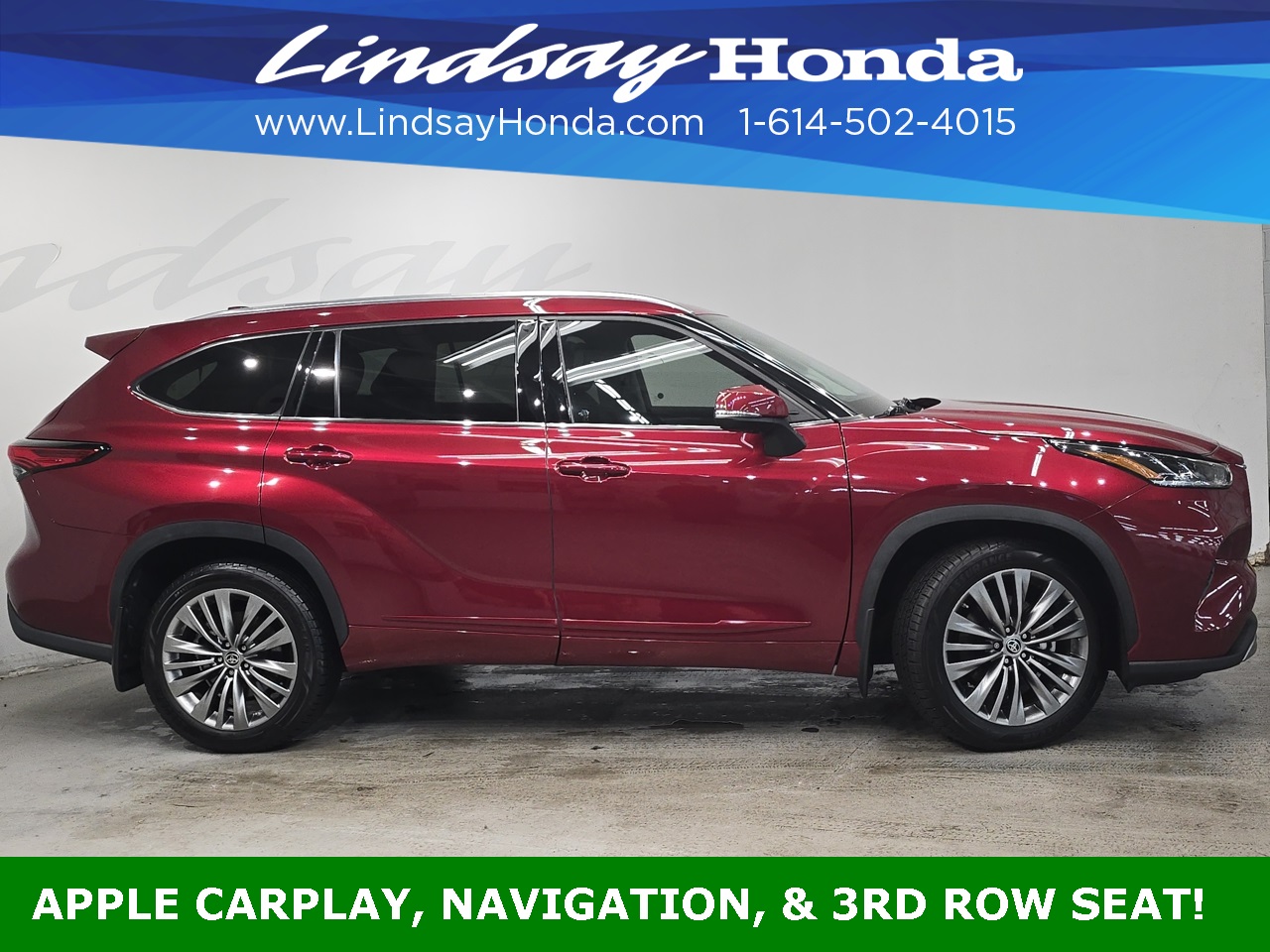 Ruby Flare Pearl 2021 Toyota Highlander Platinum AWD 8-Speed Automatic 3.5L V6 DOHC **BLUETOOTH**, **APPLE CARPLAY**, **ANDROID AUTO**, **ADAPTIVE CRUISE CONTROL**, **POWER PACKAGE**, **REMOTE START**, **BACKUP CAMERA**, **NAVIGATION SYSTEM**, **LEATHER SEATS**, **HEATED SEATS**, **CLEAN AUTO CHECK**, **ONE OWNER**, **THIRD ROW SEATING**, **POWER SUNROOF**, **POWER TAILGATE**.
