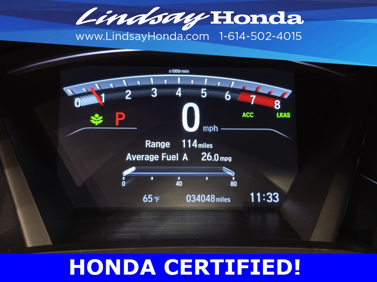 Certification Program Details: HondaTrue Certified Details: * 182 Point Inspection * Powertrain Coverage: 7 Years(From the original in-service date)/100,000 miles (whichever occurs first). * Non-Powertrain Coverage: Additional 2 years beginning at the expiration of the New Vehicle Limited Warranty, or from the date of sale of the vehicle if the New Vehicle Limited Warranty has expired at the time of sale, or up to 100,000 total odometer miles, whichever comes first. *Up to two complimentary oil changes within the first year of ownership. * Vehicle History Report * Warranty Deductible: $0 * Roadside Assistance * Transferable Warranty *SiriusXM 90-Day Trial *Honda Care Motor Club Partner for 1 year/12,000 miles Why buy from Lindsay?